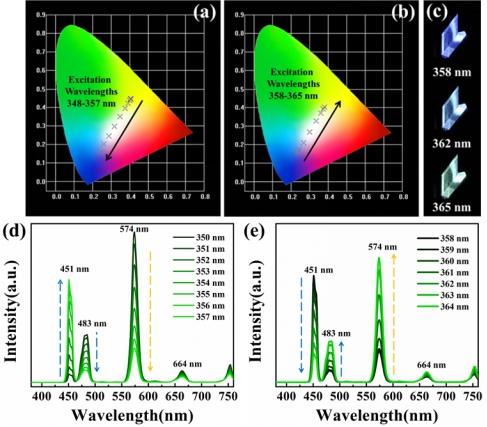 本工作制备了一系列具有连续可调谐彩色发光特性氟磷酸盐玻璃荧光体。其发射颜色可以通过精确控制激发波长,实现在蓝光-冷白-暖白-黄光的连续变化。此外,当采用353 nm和362 nm的紫外光作为激发波长时,样品可以获得非常接近于标准白光(0.333, 0.333)的颜色。
