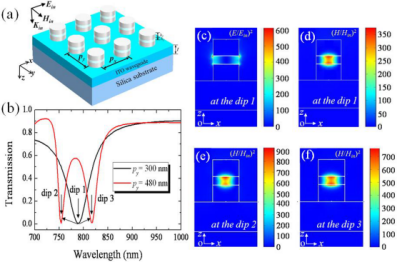 图1 (a) 置于介质波导层上超构材料的结构示意图;(b) 该体系在光正入射时数值计算的透射光谱;(c)与(d)分别表示透射谷1处的电场和磁场强度分布;(e)和(f)透射谷2和3处的相对磁场强度分布。