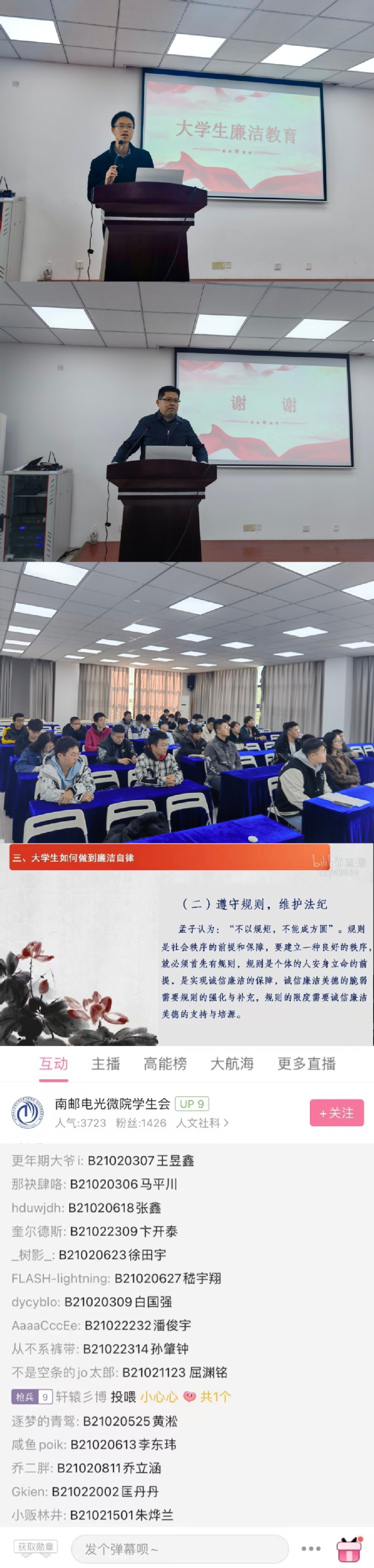 宋老师从“为什么要开展大学生廉洁教育”、“近年来党和国家的廉政建设情况”以及“大学生如何做到廉洁自律”等三个方面深入阐述了开展大学生廉洁教育的重要意义和主要内容,并结合大学生特点,鼓励同学们要坚定理想信念,敬畏校纪法规,树立廉洁观念,争做有理想、有担当、有作为的新时代青年。