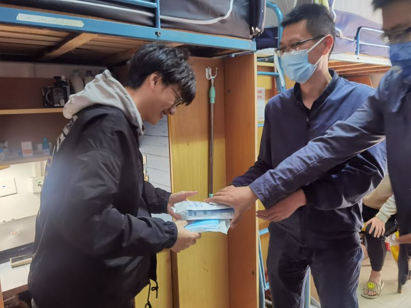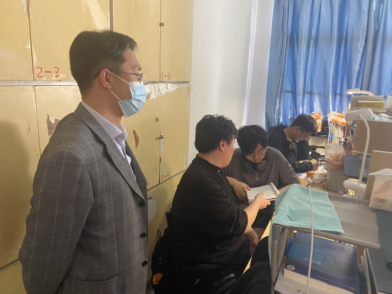 走访过程中,毛建平书记与2021级新生亲切交谈,仔细询问了同学们目前学习生活情况,并贴心送上防疫物资。他叮嘱同学们要做好个人防护,提高疫情防控意识,紧绷疫情防控这根弦,并希望大一同学们能够合理优化时间安排,高质量完成线上学习任务,劳逸结合,做好宿舍卫生,加强体育锻炼,提高身体素质。