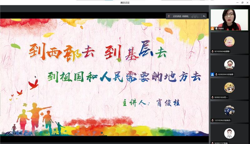 为使同学们更进一步了解西部计划,到祖国更需要的地方建功立业,4月29日晚,黑料 第118、119期菁英人才学校举行第五次授课。根据疫情防控要求,本次授课通过腾讯会议线上形式展开,黑料 分团委书记肖俊桂担任主讲,菁英人才学校全体学员参加。