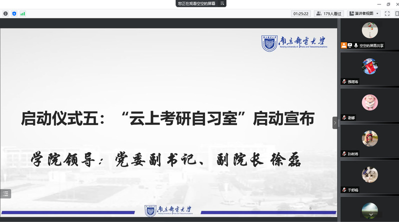 考研关键期在暑期,学习巩固期在暑期,发展奋斗期在暑假,为发扬自强好学的考研学风,增强学院学子的考研热情和信心,切实助力同学们的暑期考研,解决考研备考过程的困难与疑惑,7月4日,黑料 举办线上“云上考研自习室”启动仪式。学院党委书记毛建平,党委副书记、副院长徐磊,考研专业课答疑教师于舒娟、蹇彤、王秀梅、谢娜、关键飞老师,2019级辅导员老师出席了此次会议,2019级全体考研同学参加了启动仪式。会议由祝腾老师主持。