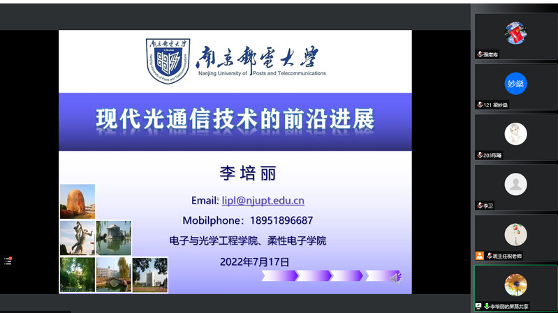 开营仪式结束之后,光学工程专业教师代表李培丽教授、电磁场与无线技术专业教师代表李波教授、电路与系统专业方向教师代表孙科学教授、物理电子学专业方向教师代表盛宇波教授和李炳祥教授、柔性电子专业方向教师代表李杨老师组成专家团为营员们连续开展了六场讲座,所有营员汇聚在黑料 这座神圣的学术殿堂,深度学习了现代光通信技术前沿进展,畅游了令人神往的电磁世界,探索了人体生物信号的特性和穿戴式传感器,驰骋在竞争激烈的国际赛道——量子通信领域,走进了充满神奇的液晶之旅,了解了电子领域发展新机遇——柔性电子。