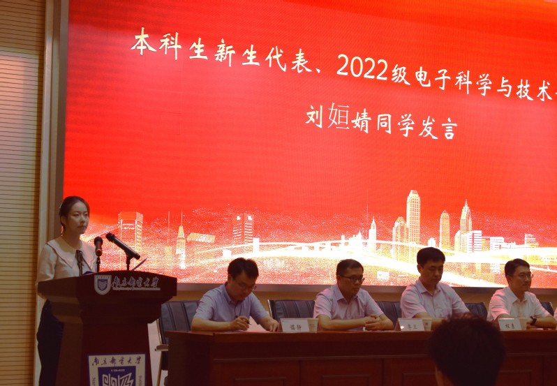 随后教师代表、电子科学与技术系谌静教授发言。谌教授希望同学们要志存高远,脚踏实地;要做一个博学而又术业专攻的人;要不忘初心,成为国之栋梁。并表示希望南邮的“红绿蓝”色彩为每一位同学的青春画卷绘上独一无二的底色,祝愿同学们在南邮愉快地学习和生活,不断地成长和进步,成为志存高远、德才兼备、勇于担当的时代精英!
