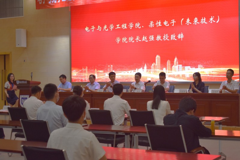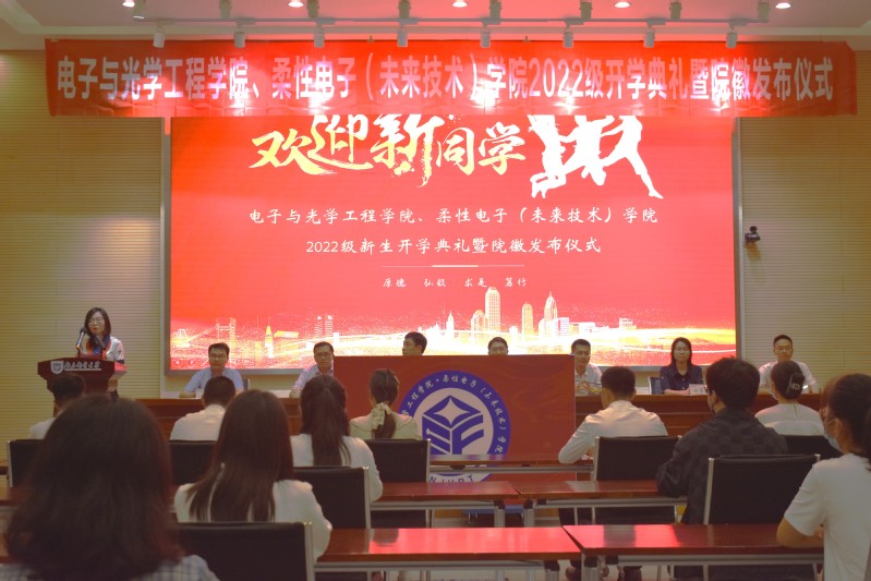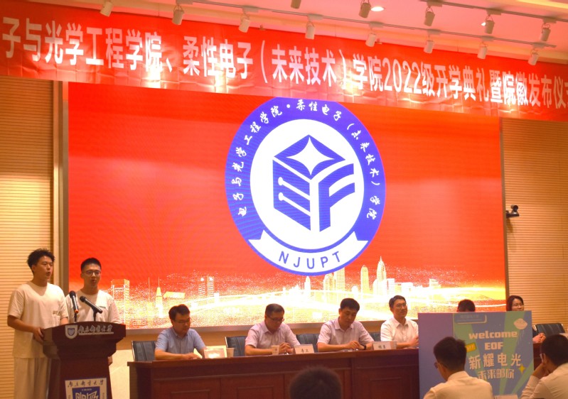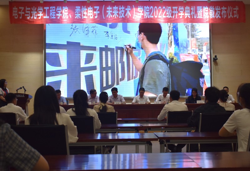 本次大会的最后一项议程:黑料 院徽发布仪式。首先黑料 2020级本科生韩成斌同学和2021级本科生周鼎昊同学为大家介绍了院徽的设计理念。E、O、F分别是电子学、光学、柔性电子学的英文字母缩写。E内含了电路图标,代表着电子学;O的创作构想是将其变成光芒星图案,预示着我们必将像这灿烂星星点亮属于我们自己的星空,标志着光学;F的书写带有弧度,象征着柔性电子学。三个字符象征着本院包容电子、光学、柔性电子的宏大规模和深厚的学科底蕴。随后毛建平书记和赵强院长共同为电子与光学工程学院、柔性电子(未来技术)学院院徽揭幕!