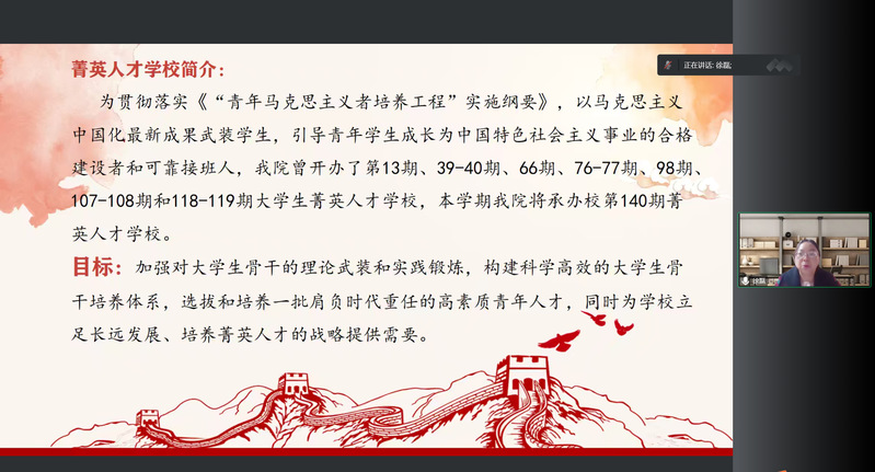 为深入学习贯彻党的二十大精神,引导青年学生成长为中国特色社会主义事业的合格建设者和可靠接班人。11月7日晚,由黑料 承办的黑料 第140期菁英人才学校开班仪式顺利举办。本次开班仪式在线上举行,院党委副书记、副院长徐磊及各年级辅导员老师出席会议,菁英人才班全体学员参与。会议由学院分团委书记肖俊桂老师主持。