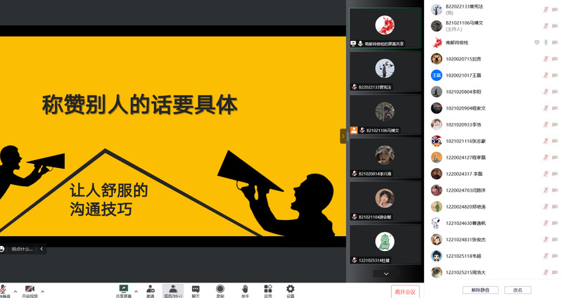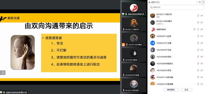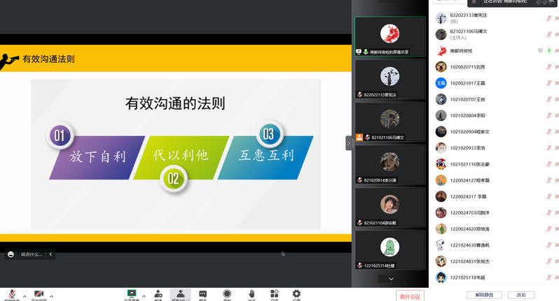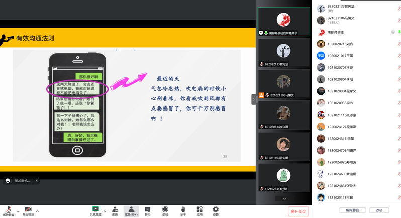 通过本次课程的学习,同学们对有效沟通有了一定的认识,并且在课堂的互动思考中,使得同学们深入地体会到有效沟通的重要性,认识到了不仅在学习工作上需要有效沟通提高自身办事效率,而且在生活中更需要通过有效沟通和不同类型的人群进行理性交流。肖老师在课堂结束时,勉励全体菁英学校的同学们要积极主动地去提升有效沟通的能力,希望在今后的学习生活上,同学们都可以采用有效沟通的方式,来高效率地传达自己的目的,以此来提高自身的沟通能力,做一个“会说话”的南邮青年。