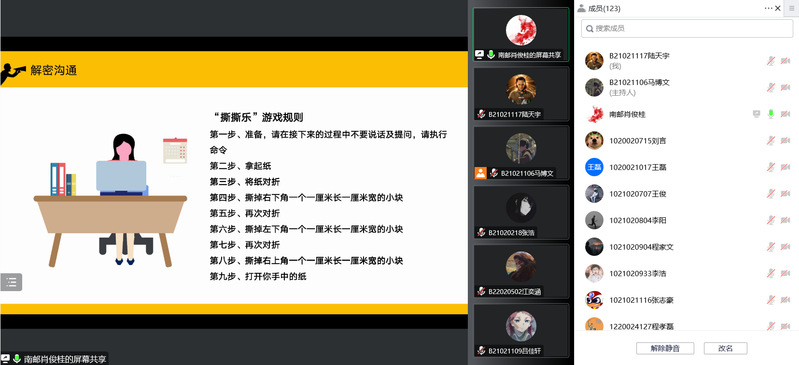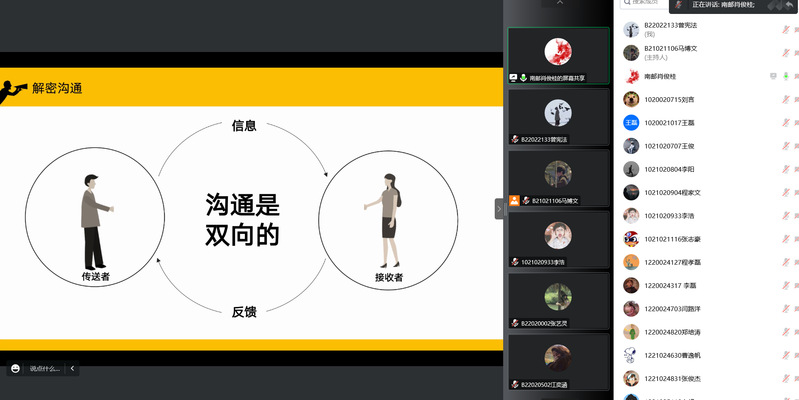 为增强学员的参与度,丰富课堂内容,肖老师在讲课前准备了几个小游戏。在游戏结束后,结合生活实际,向各位同学阐释了“沟通”一词的涵义,并展现了沟通的多种形式以及双向沟通带来的启示。