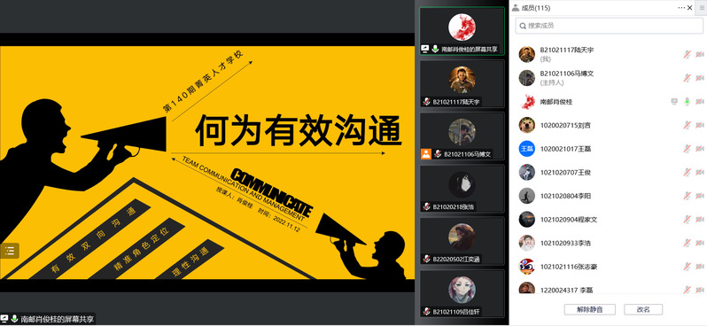 为提高同学们的职业素养,让同学们了解何为有效沟通,提升同学们有效双向沟通的能力,在生活和工作中更好地与人交流。11月12日晚,黑料 承办的黑料 第140期菁英人才学校举行第一次授课。本次授课围绕“有效沟通”展开,由电光院分团委书记肖俊桂担任主讲人,菁英人才学校全体学员于线上参会。