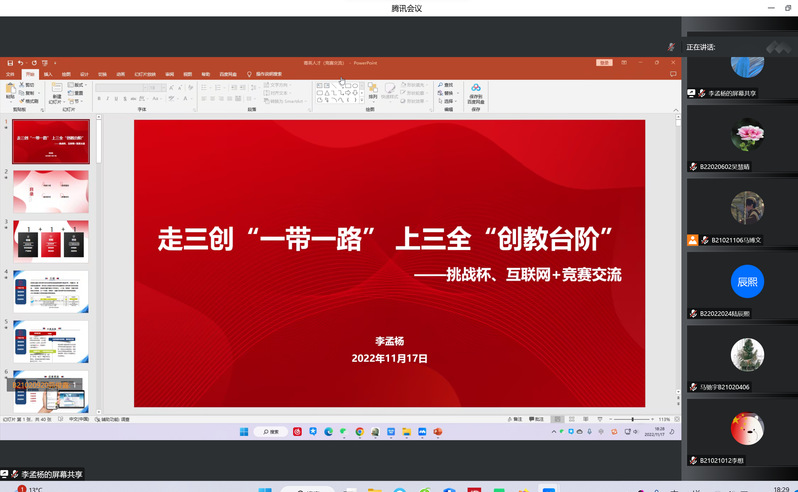 本次授课主题为《走三创“一带一路”,上三全“创新台阶”。》,旨在倡导学生积极参加、认真应对“挑战杯”和“互联网+”竞赛。