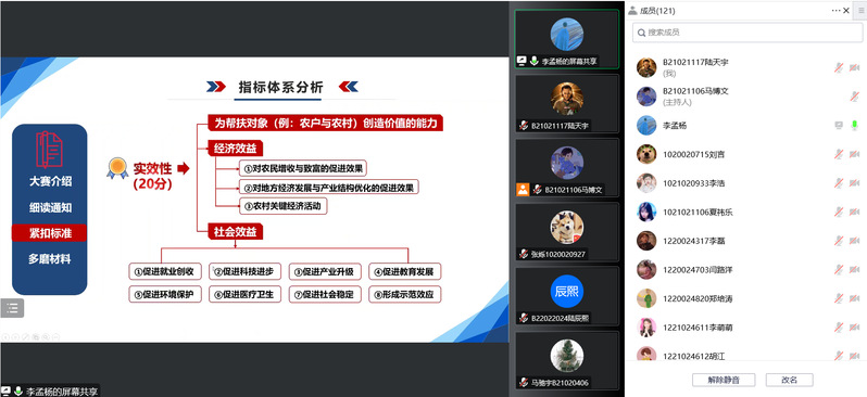 课程开始,李孟杨老师从大赛流程、大赛精神、信息渠道等方面进行了详细的大赛介绍。紧接着,李老师以PPT的形式呈现本次课程,强调了参赛同学要仔细阅读大赛通知,关注赛道、组别、资格等相关材料。随后,李老师结合视频、商业计划书、参赛者的参赛经历,带领同学们了解竞赛的各组评分标准,之后还提出网评材料、赛事准备、路演技巧方面的建议。