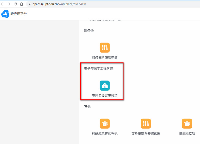 请至企业微信中进行预约,路径为:工作台->智能填报->应用中心->电光柔会议室预约。