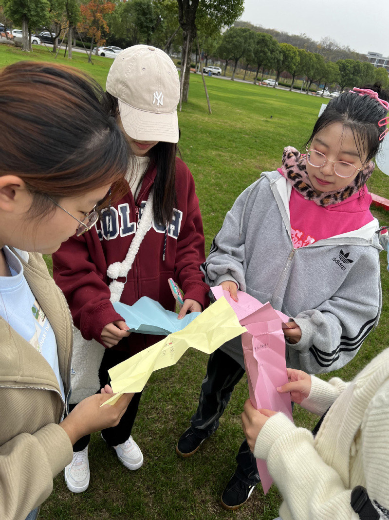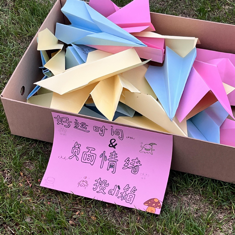 遵循疫情防控要求,活动均在室外举行。11月22日,同学们来到图书馆前的草坪上,在心理委员的安排下,现场既井然有序又不失活动氛围。同学们先领取卡片,在上面写下自己最近发生的开心或者烦恼的事情,然后折成纸飞机放入“好运时间&负面情绪投递箱”。随后,同学们随机从中抽取一个纸飞机,打开并对其留言,或许是与纸飞机的主人分享喜悦,或许是写下了安慰人心的话语,但这都让大家感受到了彼此之间浓浓的关心与祝福。