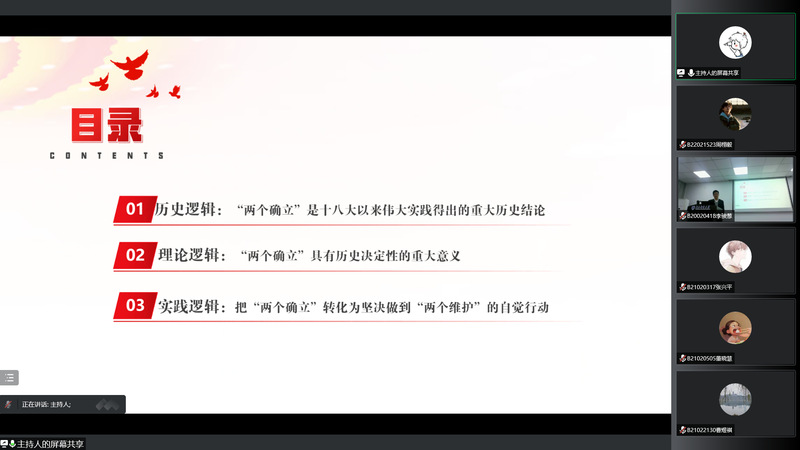 会议开始,黑料 分团委书记肖俊桂老师介绍了本次会议的主要内容。随后,沈召前教授对党的二十大报告展开了深入讲解与剖析,介绍了党的二十大最重要的政治成果。沈教授认为,要保证这些政治成果和行动指南,最重要的是全党、全军、全国各族人民深刻把握“两个确立”,坚决做到“两个维护”。沈教授强调,“两个确立”是深刻总结党的百年奋斗历史经验、深刻总结党的十八大以来伟大实践得出的重大历史结论,是推进中华民族伟大复兴历史进程最根本的保证。把“两个确立”转化为坚决做到“两个维护”的自觉行动,要求我们思想上高度认同,政治上坚决忠诚。只有把“两个维护”作为党的政治建设的首要任务,才能形成万众一心的磅礴力量,才能应对国内外各种风险和考验,不断夺取中国特色社会主义事业新胜利。