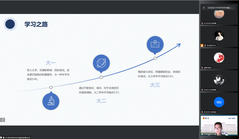 在25日的故事分享中,专业绩点第一,以一作发表多篇SCI论文的饶思思同学首先带来了自己的学习故事。她阐述了自己大学后从处于迷茫状态到找到学习目标方向的转变,用最终保研的结果向大家证明了及时找到适合自己的学习道路并为之努力的重要性。随后,曾任黑料 科协主席,荣获多项竞赛奖项的代军同学就各类竞赛的最佳参赛时间、比赛重点向大家进行了讲解,指导大家根据自身优势选择适合自己的竞赛项目。获得过一等奖学金、三好学生、校长嘉奖令以及多项国家级奖项的唐承乾学长重点就电子设计类竞赛向大家详细介绍了竞赛特色以及涉及保研的竞赛成就要求,鼓励同学与志同道合的同学共同研讨、齐力奋斗。