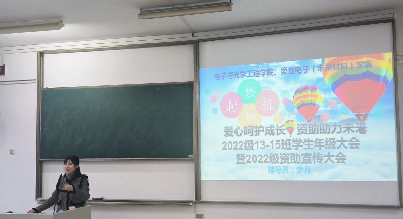 为进一步宣传资助政策,努力构建全员、全过程、全方位资助育人格局,提升资助育人实效,推动资助育人宣传工作,11月30日下午,黑料 在教2—304举办“爱心呵护成长,资助助力未来”2022级资助宣讲活动。本次活动由辅导员李月主持,2022级光电信息科学与工程专业13-15班全体学生参加。