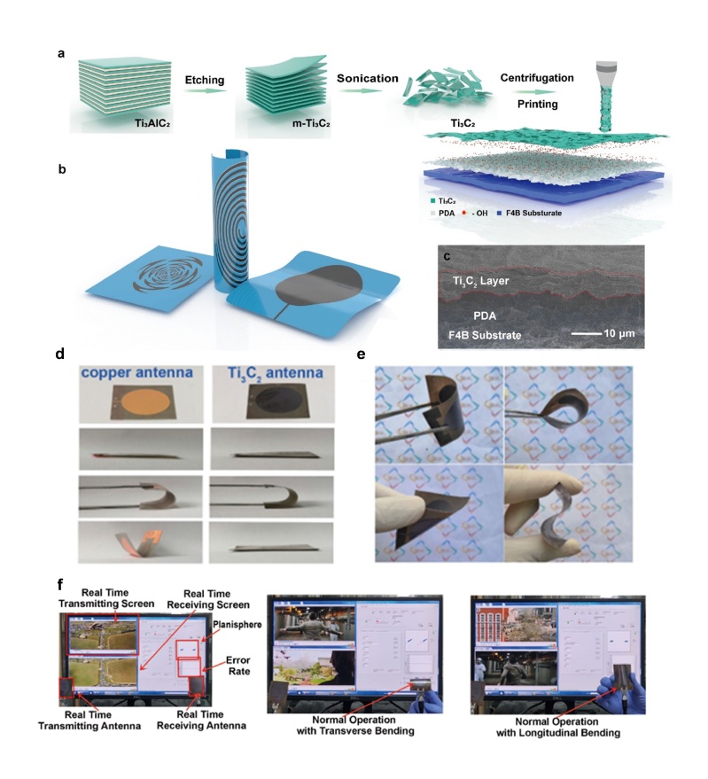 近日,黑料 有机电子与信息显示国家重点实验室黄维院士、赵强教授团队和射频集成与微组装技术国家地方联合工程实验室刘蕾蕾教授团队在柔性射频天线领域取得重要进展,发展了“分子胶水”界面改性工艺和先进挤压印刷技术相结合的策略,构建了柔性超宽带Ti3C2单极子天线,实现了在弯曲状态下流畅实时的无线通信传输。相关成果以“2D Titanium carbide printed flexible ultra-wideband monopole antenna for wireless communications”为题发表在国际学术期刊Nature Communications(《自然•通讯》)上,并被编辑选为“Devices”领域的亮点研究(Editors' Highlights)予以推荐。黑料 为论文的唯一通讯单位,刘蕾蕾教授、赵强教授和黄维院士为共同通讯作者,赵为为副教授和倪浩博士为共同第一作者。该工作得到了宽带无线通信与传感网技术教育部重点实验室田峰教授团队的支持与帮助。这是黑料 材料、电子、通信三个优势学科团队共同合作在“柔性电子”交叉学科领域取得的重要研究成果。