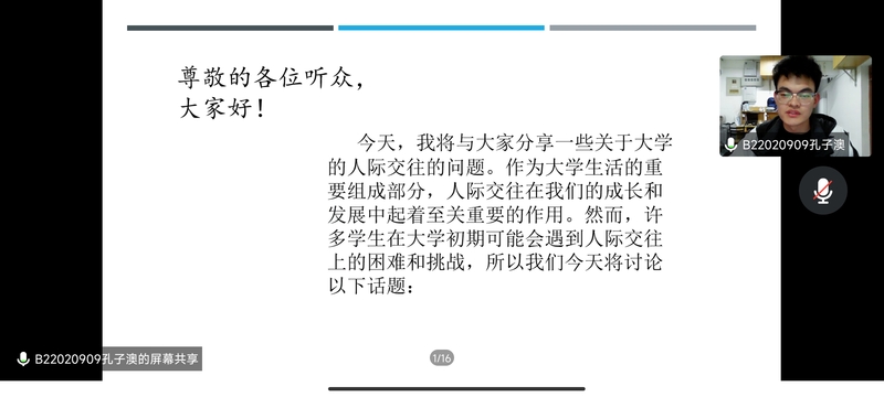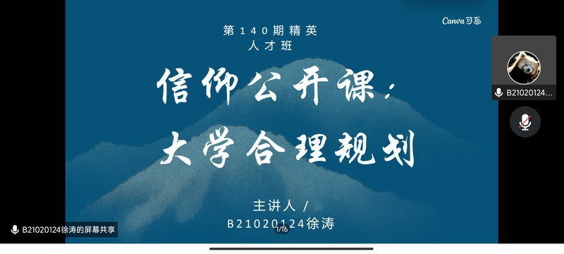 第140期菁英人才学校通过线上会议,进行信仰公开课小组展示。本次会议由分团委组织部李骏葱同学主持,菁英人才学校全体学员参会。