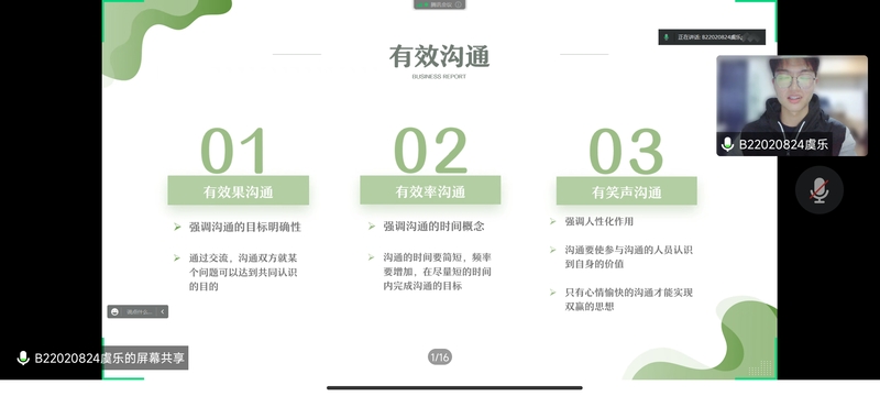 首先,关于“如何度过大学生活”,第一组的汇报人虞乐同学以“有效沟通”为主题,分别阐明有效沟通的三障碍,三原则,强调倾听的重要性并分享沟通技巧;第十二组李开敏同学同样讲解“有效沟通”,并对何为有效沟通进一步阐释与分析;以“大学生人际交往”为主题的第二组孔子澳同学和第十三组李浩同学,分别对人际交往中的个人发展与进行正确的人际交往提出了建议;第三组徐涛同学以“大学规划”为主题,列举大学生可以通过社团、健身、考研、实习来提升自己理论与实践能力,尽早接触社会。第四组董晓慧同学以“大学生竞赛”为主题,介绍了竞赛的背景类型、准备技巧,并强调了竞赛能带给学生良好的学科素养以及美好的回忆。