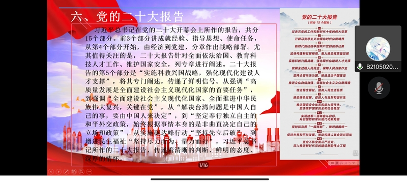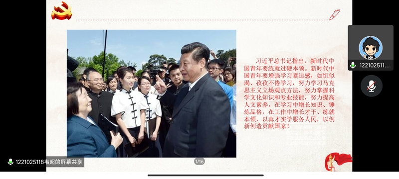 而后,对于“争做新时代新青年”,第七组鲁静雯同学以“学习贯彻党的二十大精神”为主题,重点提出青年要做到五个牢牢把握,从心向党;第十组姚湘同学以“做信达天下的南邮学子”为题,讲述南邮发源史,传递南邮红色基因,点明南邮立德树人的教育总方针;其后,第十一组主讲人韦超同学,通过列举南邮学子为社会奉献的例子,号召在新时代背景下,新青年应当接力奋进,砥砺前行。