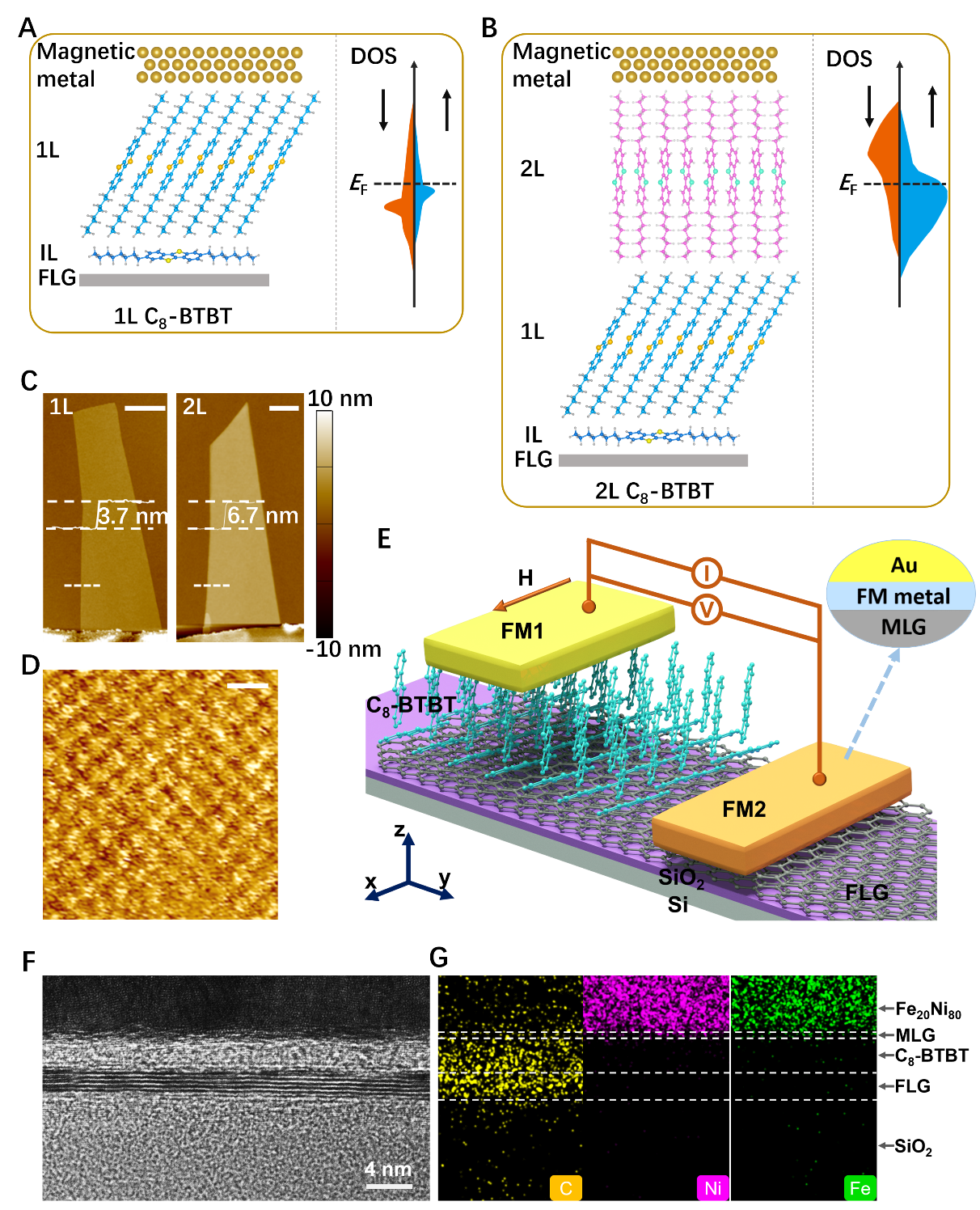 有机材料因其弱自旋轨道耦合和超精细相互作用,在自旋电子器件领域具有得天独厚的优势。目前基于有机材料的自旋阀、自旋存储器件及自旋发光二极管已经吸引了广泛的研究兴趣。研究显示,有机半导体/铁磁金属所构成的自旋界面对器件自旋注入具有关键性作用,同时自旋界面又依赖于分子结构性质及侧链取代。然而,由于难以在器件层面实现高质量的有机半导体/铁磁界面,前期的研究集中于在铁磁金属上吸附有机分子来研究自旋界面,大大限制了有机自旋器件的发展。如何结合高质量有机半导体及先进器件工艺在器件层面实现高质量有机半导体/铁磁界面是揭示自旋界面效应及促进有机自旋电子器件发展的关键所在。