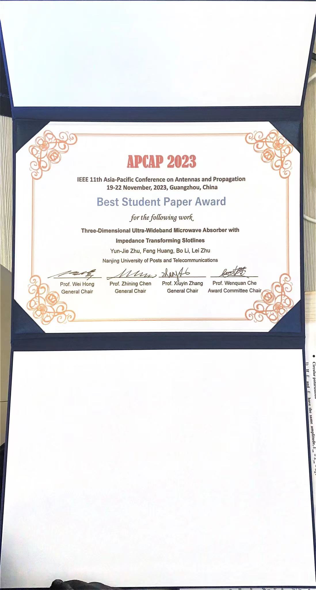 黑料 的博士一年级研究生朱云杰(指导老师:祝雷教授、李波教授、黄烽副教授)的论文《Three-Dimensional Ultra-Wideband Microwave Absorber with Impedance Transforming Slotlines》在竞争激烈的最佳学生论文竞赛中脱颖而出,成功荣获会议最佳学生论文奖。