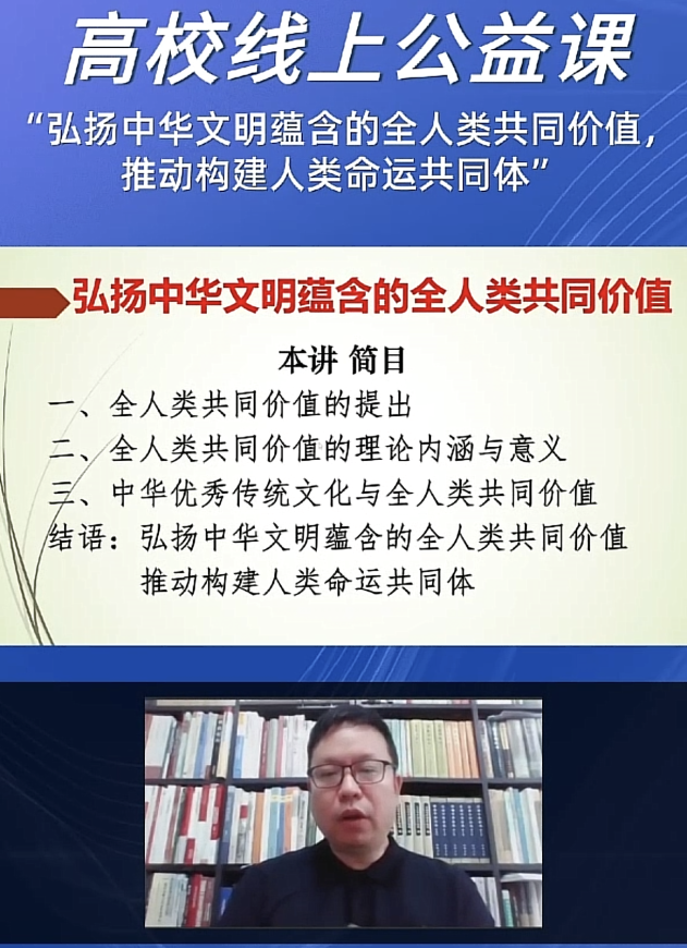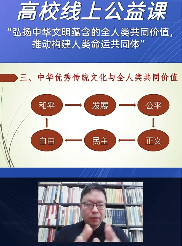为帮助同学们学习了解人类命运共同体的时代意义及深刻内涵,领悟认同中华文化对全人类的共同价值。近日,黑料 第169期菁英人才班第二次授课通过高校线上公益课的方式举行,课程主题为——弘扬中华文明中蕴含的全人类共同价值,推动构建人类命运共同体,由中央社会主义学院中华文化教研部副主任翁贺凯教授主讲。