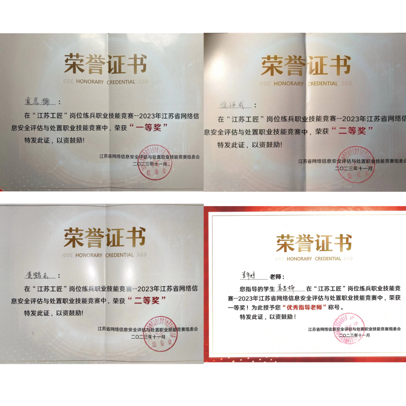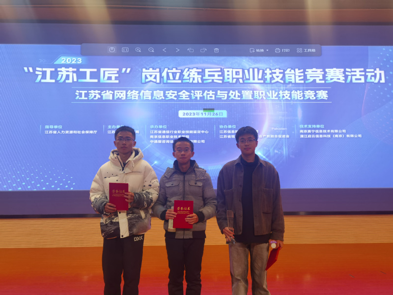 本次竞赛为省级一类竞赛,赛项共分为初赛和决赛两个阶段、职工组和学生组两个赛道,全省共计1200多名选手参加初赛,210名选手参加决赛,决赛于11月26日在南京信息职业技术学院举行。黑料 三名学生鏖战4个小时,经过综合理论考核、CTF解题考核、安全分析与运维考核、综合分析与报告考核等四个模块的比赛,最终获得了综合成绩学生组一等奖一名(袁思楠)、二等奖两名(徐泽成、黄鹤东)的好成绩;李华婷老师被授予“优秀指导教师”称号。在备赛期间,参赛团队合理安排训练计划,线上线下开展技术交流、战略战术讨论,突破疑难问题,坚持不懈,发扬了“不服输、敢争先”的精神。