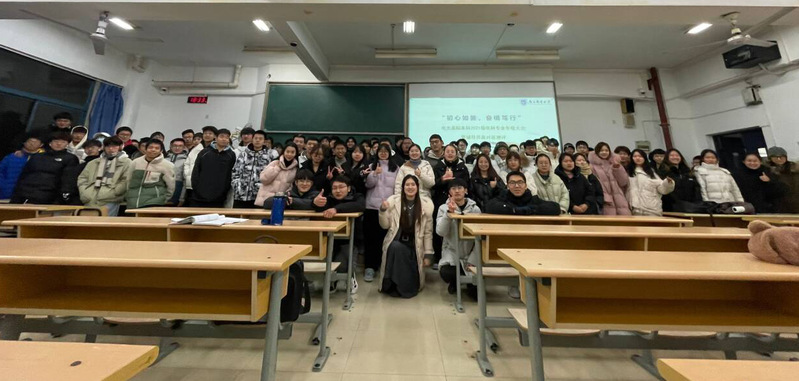 大会伊始,刘心宇老师向同学们介绍了学期日常工作情况,强调了课堂考勤与离校考勤等纪律性问题,并从安全的角度提醒大家要重视宿舍安全,请大家严格遵守校纪校规。随后刘老师详细为同学们介绍了本学期党团建设情况、评奖评优展示、年级活动开展情况等,重点表扬了雪天扫雪的党员先锋。其次刘心宇老师在大会上与同学们共同顺利完成了“辅导员与学生面对面”工作测评。大会最后,刘老师在临近期末时段为大家提出了期末复习的指导建议与复习要求,提醒同学们提高防范意识,严肃考风考纪,并说明了违纪处分条例,并预祝同学们学业顺利,取得理想成绩。在会议结束前,辅导员刘心宇同全体2021级电科专业学生热情合影留念。