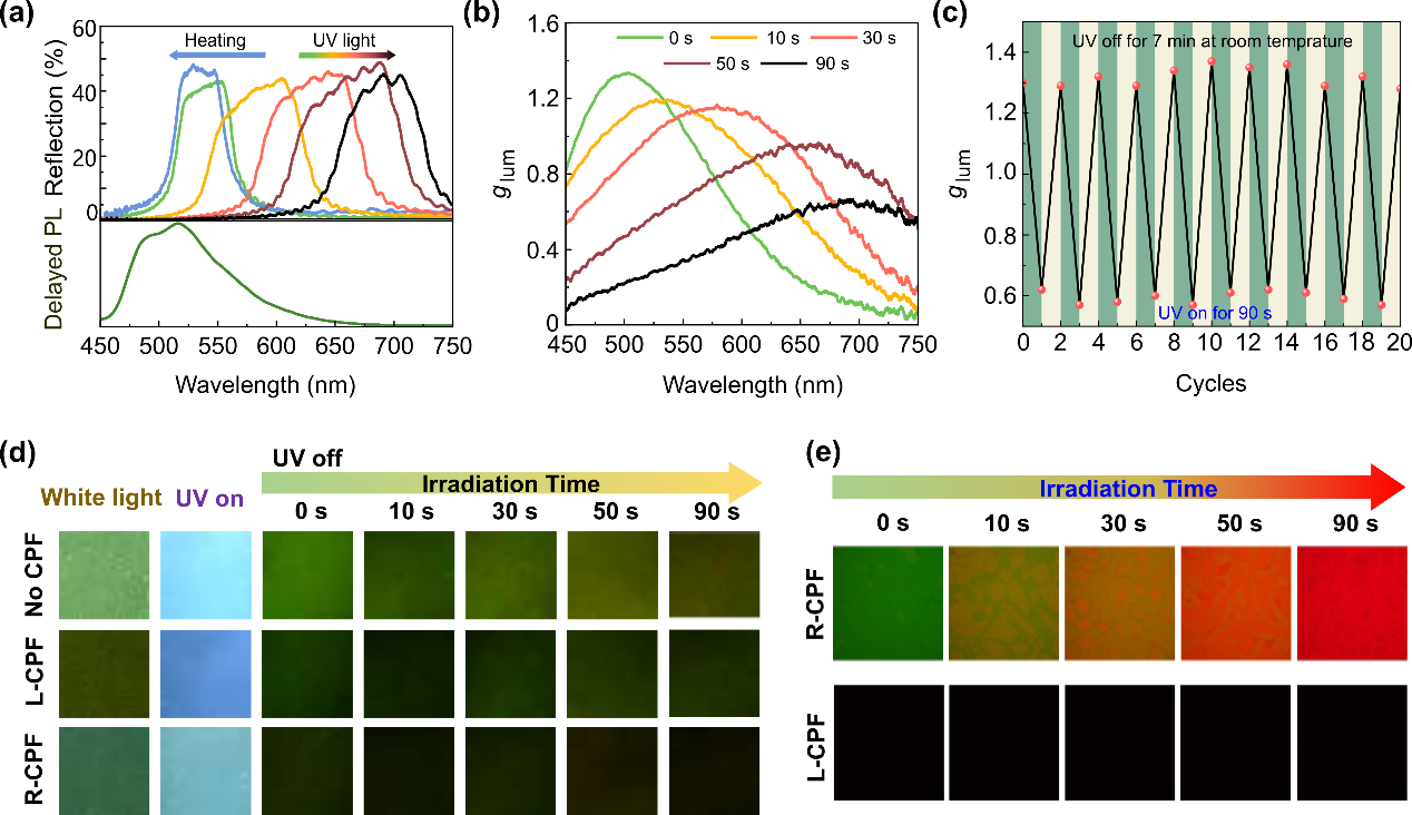 图 2. P1-SHS双层薄膜中圆偏振有机室温磷光性能的动态调控。