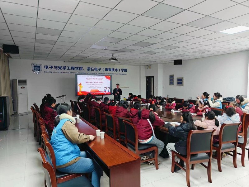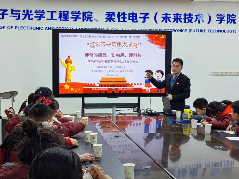 参观完实验室后,李炳祥与少先队员们开展了题为“神奇的液晶:软物质、硬科技”的科普交流会。交流会上,同学们观看了黑料 80周年校庆主题宣传纪录片,了解了黑料 的红色历史、发展历程和瞩目成就。接着,李炳祥向同学们科普了液晶在显示与非显示领域中的科研应用,并鼓励同学们投身科研,探索液晶科学的星辰大海。李炳祥引用习近平总书记给南京大学留学归国青年学者回信中的话语勉励同学们:“以报效国家、服务人民为自觉追求,在坚持立德树人、推动科技自立自强上再创佳绩,在坚定文化自信、讲好中国故事上争做表率,为全面建设社会主义现代化国家、实现中华民族伟大复兴的中国梦积极贡献智慧和力量!”