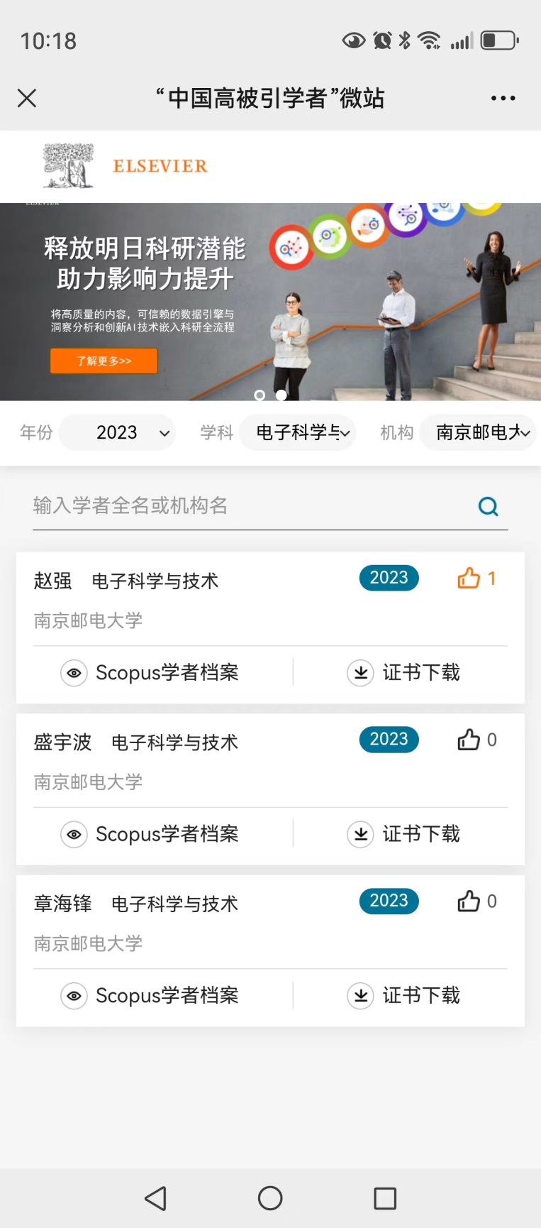 2024年3月27日,全球性信息分析公司爱思唯尔(Elsevier)正式发布了2023“中国高被引学者”(Highly Cited Chinese Researchers)榜单。南邮共有8名教师入选。其中黑料 赵强教授、盛宇波教授、章海锋教授3名教师入选。
