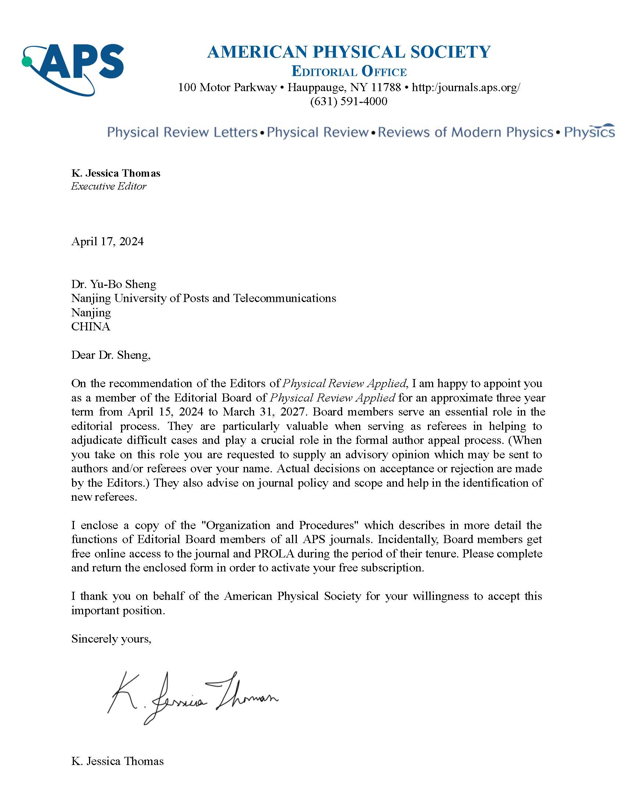 近日,由美国物理学会(APS)旗下期刊《Physical Review Applied》主编Eager教授和多位副主编面试并推荐,美国物理学会出版社执行主编Jessica Thomas博士发来正式邀请函。邀请黑料 盛宇波教授担任《Physical Review Applied》期刊编委 (Editorial Board Member),主要负责量子光学、量子信息等方向的稿件处理。