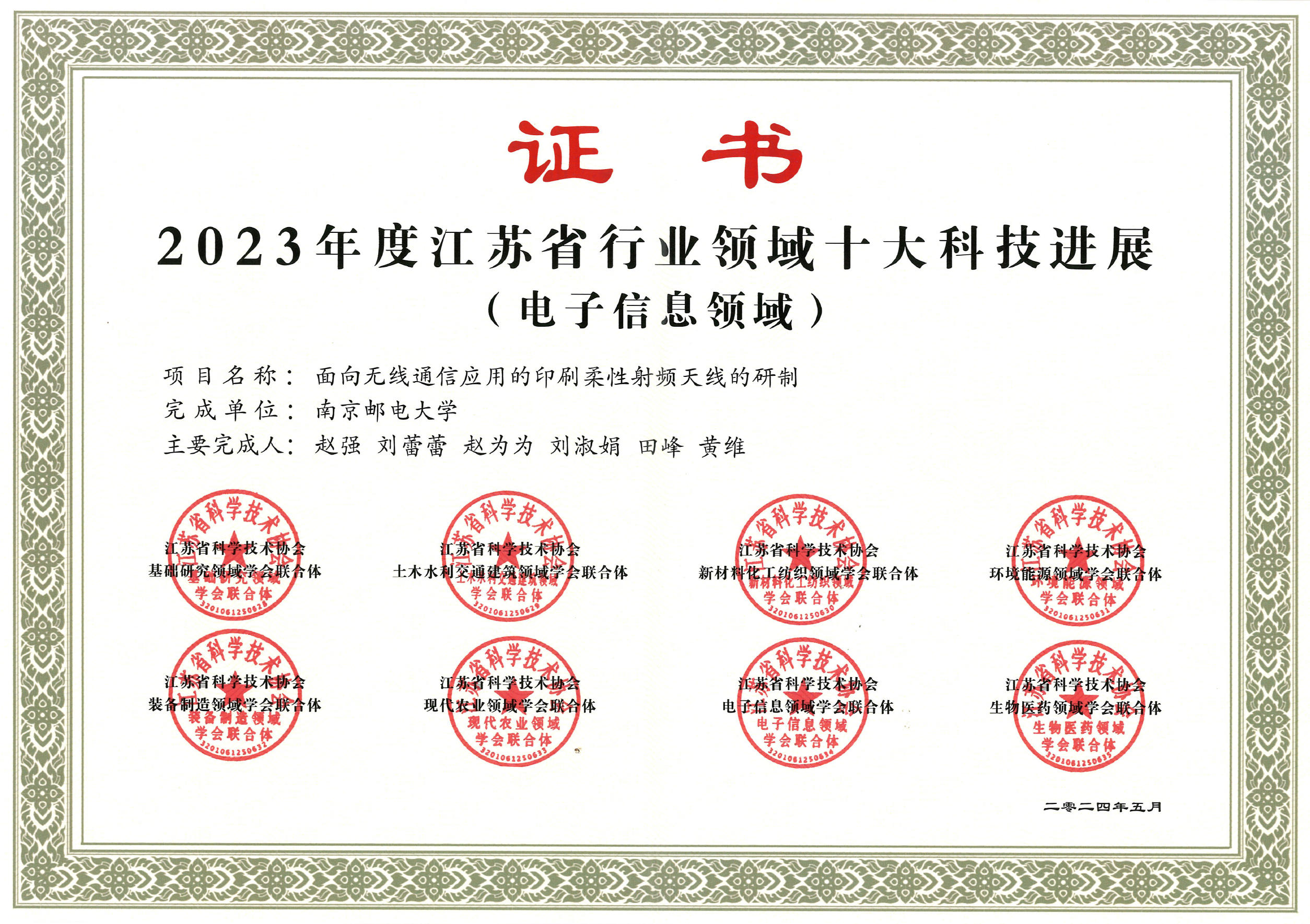 在第八个全国科技工作者日来临之际,由江苏省科学技术协会、江苏省科学技术厅主办的2024年全国科技工作者日江苏省主场活动在南京举行。会上,发布了2023年度江苏省行业领域十大科技进展。黑料 有机电子与信息显示国家重点实验室黄维院士、赵强教授团队联合射频集成与微组装技术国家地方联合工程实验室刘蕾蕾教授团队、宽带无线通信与传感网技术教育部重点实验室田峰教授团队完成的“面向无线通信应用的印刷柔性射频天线的研制”成果入选“电子信息领域”十大科技进展。