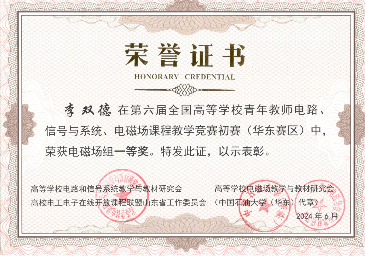 近日,第六届全国高等学校青年教师电路、信号与系统、电磁场课程教学竞赛初赛(华东赛区)在中国石油大学落下帷幕。来自浙江大学、同济大学、山东大学等6省1市(江苏、浙江、福建、安徽、山东、江西、上海)的40余所高校的教师同台竞技。经过激烈角逐,黑料 青年教师李双德荣获电磁场组一等奖第一名,展示了黑料 本科教学水平和青年教师风采。