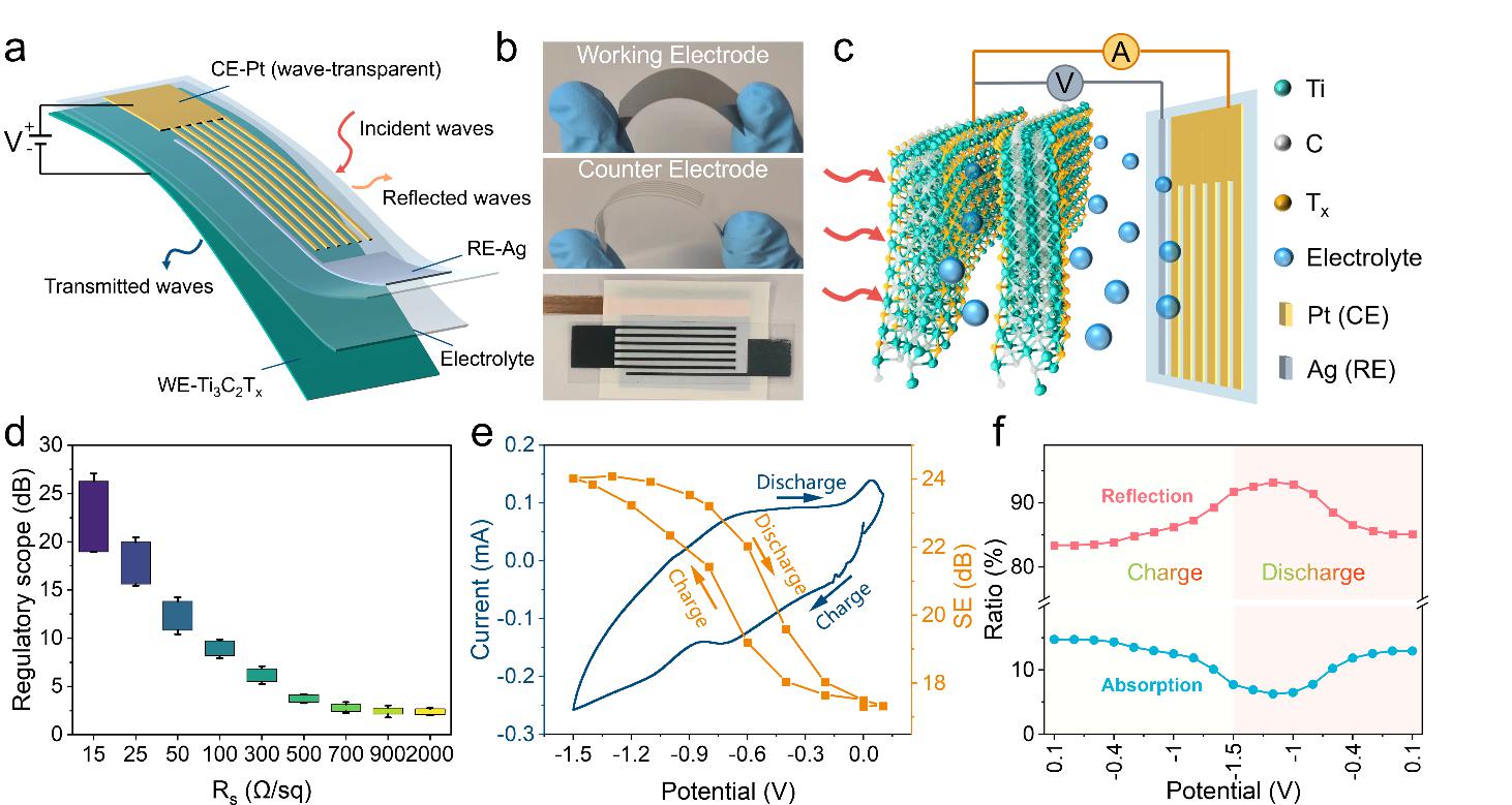 面对日益复杂的电磁环境,对于能够动态调整电磁屏蔽能力的新一代材料或器件的需求日益迫切,特别是在柔性可穿戴电子产品领域,柔性智能电磁屏蔽器件展现出巨大的应用前景。有鉴于此,赵强教授研究团队创新性地提出了一种基于超薄Ti3C2Tx薄膜的柔性电化学可调谐电磁屏蔽器件。该器件利用Ti3C2Tx在电化学过程中充电状态和表面化学的转变,实现了显著的电磁屏蔽切换。在0.1 V到-1.5 V的电压驱动下,该器件能够实现18.9至26.2 dB的可逆屏蔽效果调制。研究还发现,Ti3C2Tx纳米片的尺寸对器件的屏蔽调制能力具有重要影响,较小的片径尺寸能够提供更高的吸收调制能力,从而使器件具备良好的可设计性。通过与Salisbury屏幕和双层谐振腔结构结合,该团队还实现了可调反射抑制比高达32 dB的动态伪装表面,以及以吸收为主(超过90%)的微波响应开关。该研究为未来复杂环境中的电子保护和主动伪装提供了多功能且有效的解决方案。