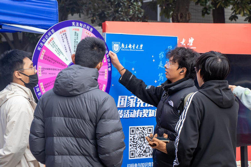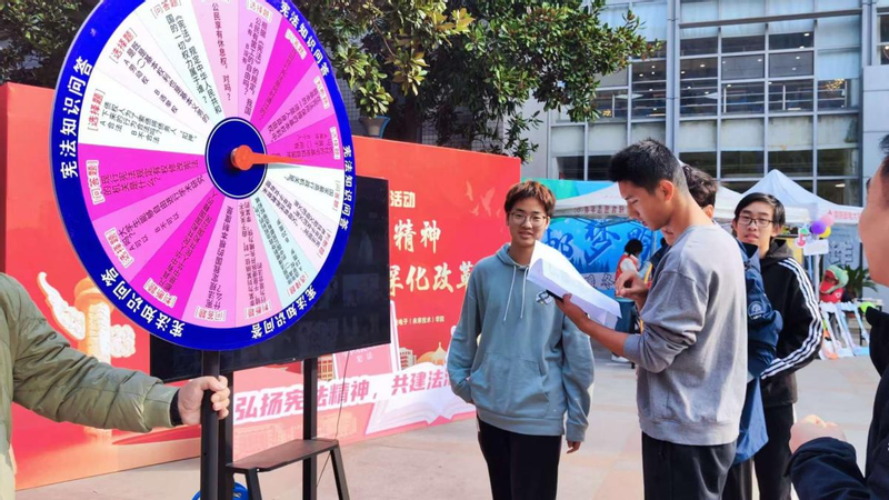 12月3日,由校党委宣传部、法制办公室联合主办,黑料 承办的“国家宪法日”主题活动在仙林校区南二食堂外场举行。活动现场,工作人员通过播放宪法宣传视频,展示与讲解宪法宣传展板,发放宪法宣传手册和普法书籍,提供公益法律咨询服务,开展“12.4宪法知识竞答”“宪法大转盘”游戏、“我与宪法合照”等方式,向过往师生普及宪法知识,为黑料 师生带来一场互动式、零距离的普法新体验。