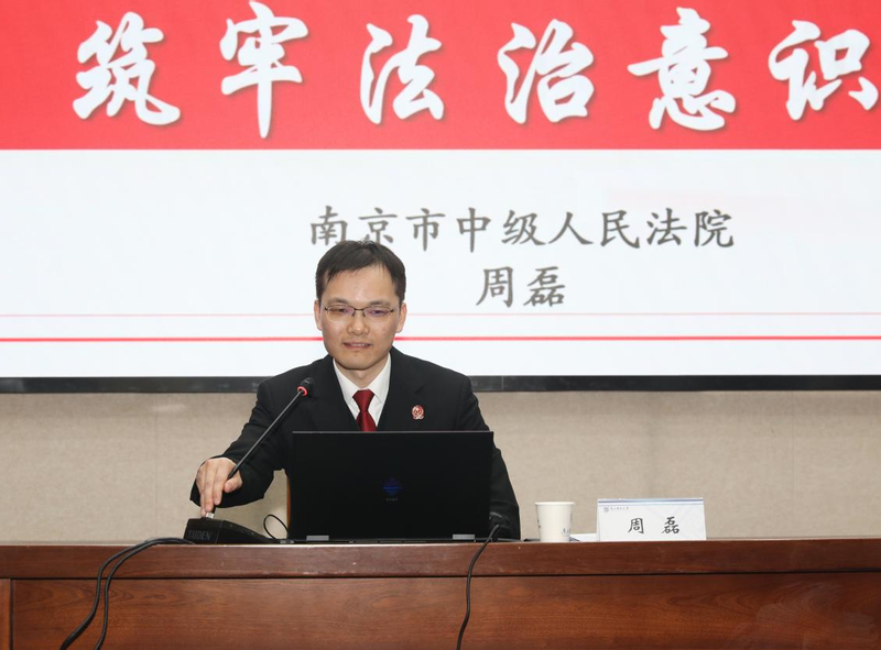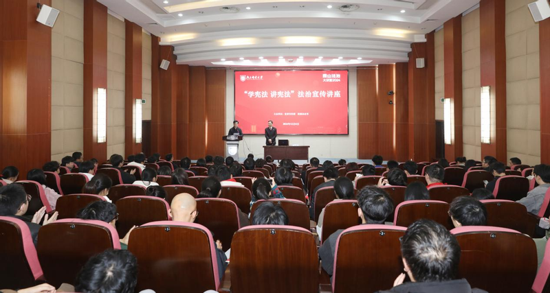 12月6日,黑料 在仙林校区中天科技报告厅召开普法讲座,南京市中级人民法院行政审判庭副庭长周磊应邀出席并主讲,黑料 师生代表积极参加。周磊副庭长以“弘扬宪法精神 筑牢法治意识”为题,从宪法的庐山真面、生活中的宪法“关键词”、做宪法的自觉遵守者三个方面展开普法教育。他向师生介绍了宪法的发展史、宪法的特征、宪法的基本原则,并结合真实典型案例,提出要树立宪法至上的观念,认真学习宪法知识,养成宪法思维,在具体的生活场景中用宪法来维护国家利益、公共利益和公民权利。
