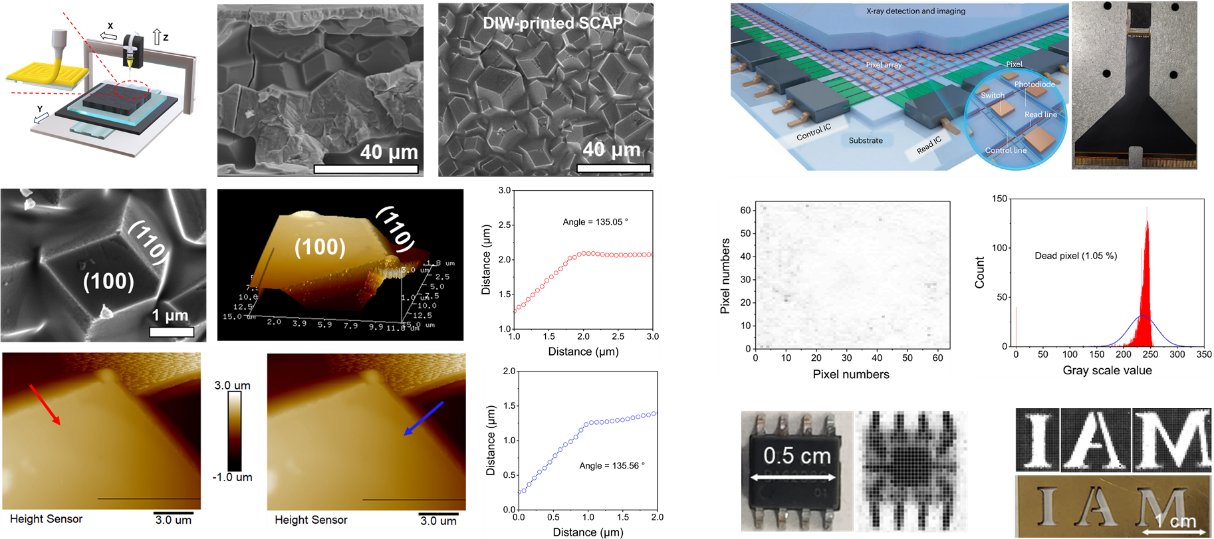 作为当前最受瞩目的X射线探测材料,钙钛矿及其X射线探测器的研发为我国突破X射线成像这一“卡脖子”技术带来了契机,然而,兼容TFT电子读出背板高质量钙钛矿厚膜的制备是当前限制钙钛矿X射线探测器发展的瓶颈难题。有鉴于此,黑料 赵强教授、徐修文教授团队自主发展了一种全新的直写印刷(Direct-ink-writing, DIW)单晶组装钙钛矿制备工艺,研制出TFT集成的X射线面阵探测器,实现了高分辨的X射线数字成像。相关成果以“Direct ink writing of single-crystal-assembled perovskite thick films for high-performance X-ray flat-panel detectors”为题发表于国际权威期刊Advanced Functional Materials。
