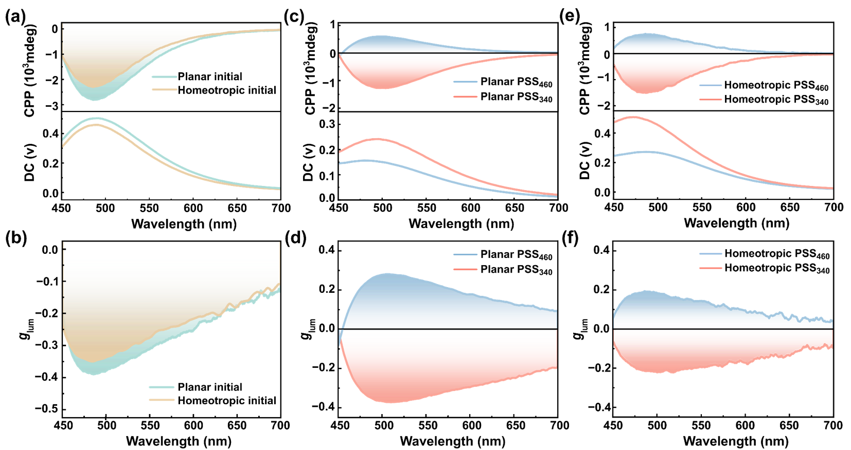 图2.基于光驱动肼基光开关(M1)的软螺旋超结构(SHS)层和室温磷光聚合物(RTP)聚合物层的CP-OURTP薄膜在初始状态下(a, b), PSS460 状态下和PSS340状态下,分别在平行取向 (c, d)和垂直取向(e, f)下的圆偏振磷光(CPP)信号和发光不对称因子(glum)曲线。