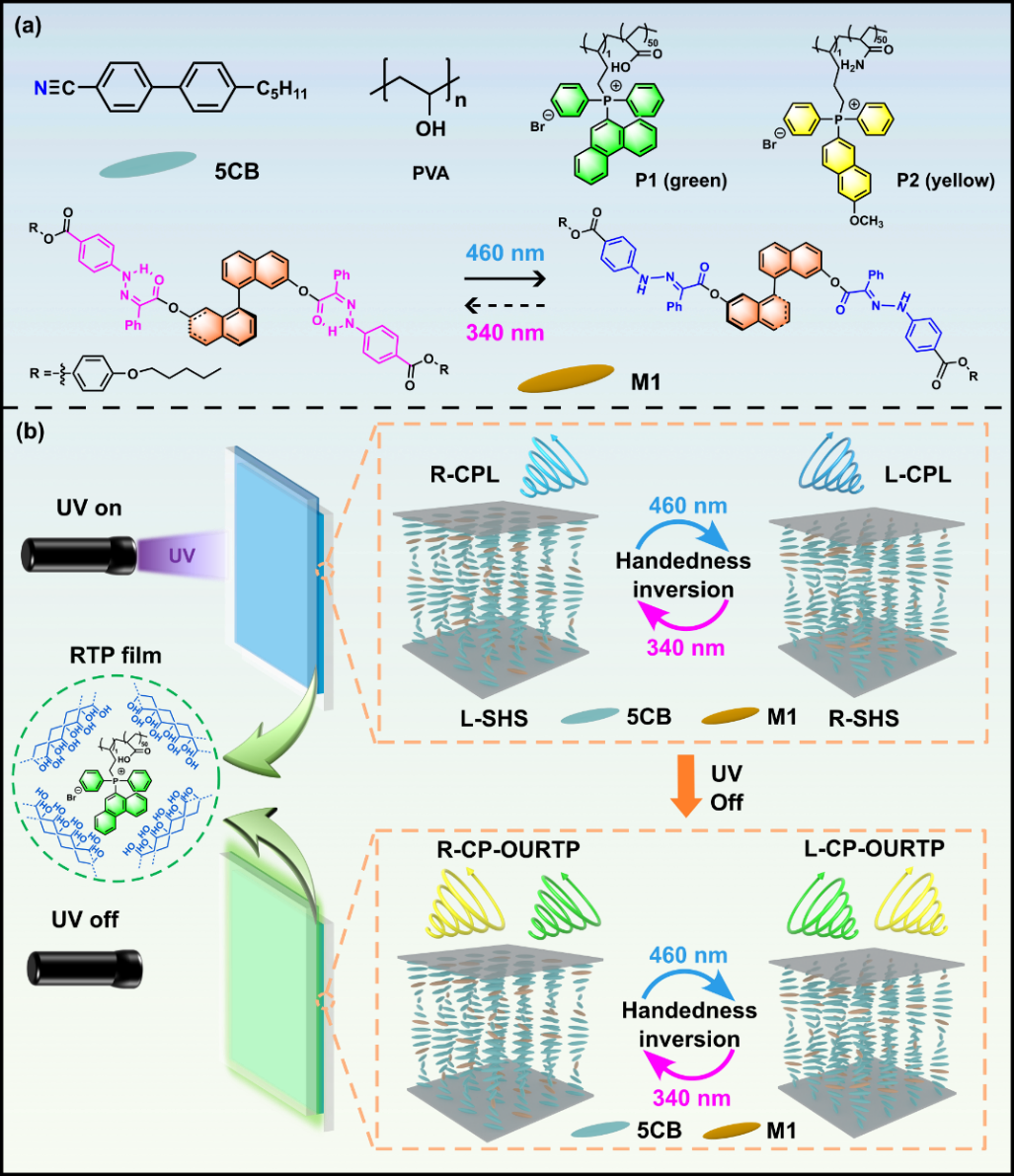 图1.双层圆偏振有机超长室温磷光(CP-OURTP)薄膜中实现手性翻转动态调控的分子结构和示意图。(a)所需材料的分子结构(b)双层CP-OURTP薄膜动态手性翻转示意图。