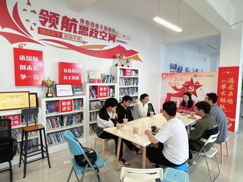 以“更多元的空间、更温暖的教育、更开放的办学、更自主的学习”满足研究生个性化、精准化、智慧化成长需求,规划建设了智慧育人空间,有效连通学习空间与生活社区、联通物理空间和数字资源,不断深化“导学·思政空间”的育人功能和文化内涵,使其成为智慧育人新载体。该空间以红绿蓝三色为底色,以数字化赋能,以电子信息特色文化元素为布置背景,邮政、信息、电子等育人元素随处可见、触手可及,发挥红色文化“漫浸润”育人作用,打造绿色智慧育人空间。空间内,设有心灵气象站、邮信读书角、师生交流空间、自主研讨空间、自主阅读空间、自主服务空间、红色基因和蓝色梦想文化展示区域等等。实现线上线下学习、科研、教学、生活等功能融通,形成“专人负责、导师指导、学生自治”的“导学·思政空间”。