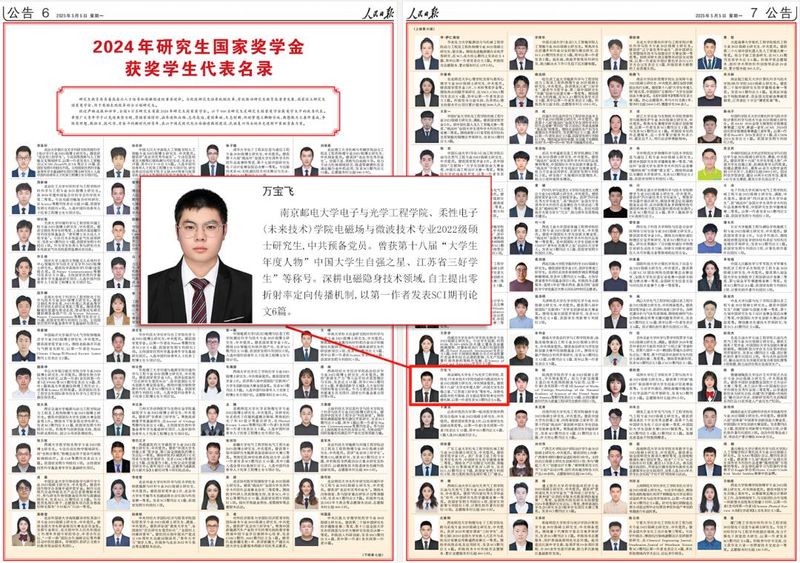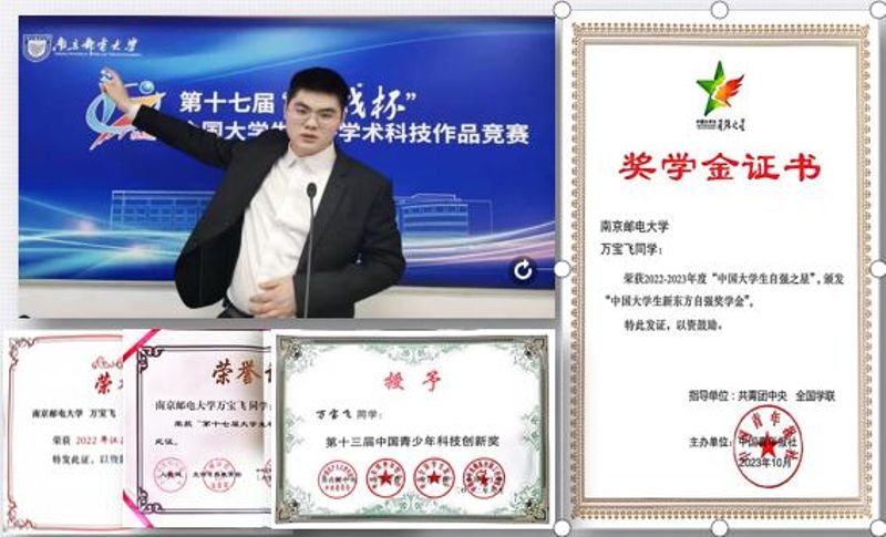 李双德博士连续四年担任博士第一党支部书记,志愿参加扶贫支教,辅导贫困学子200余人,荣获全国首批高校“百名研究生党员标兵”、中国大学生自强之星等荣誉40余项。万宝飞入选《人民日报》国家奖学金获奖学生代表名录,获得第十八届全国“大学生年度人物”、中国青少年科技创新奖、中国大学生自强之星、江苏省最美大学生等荣誉称号。