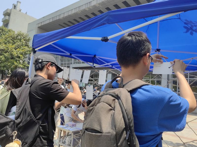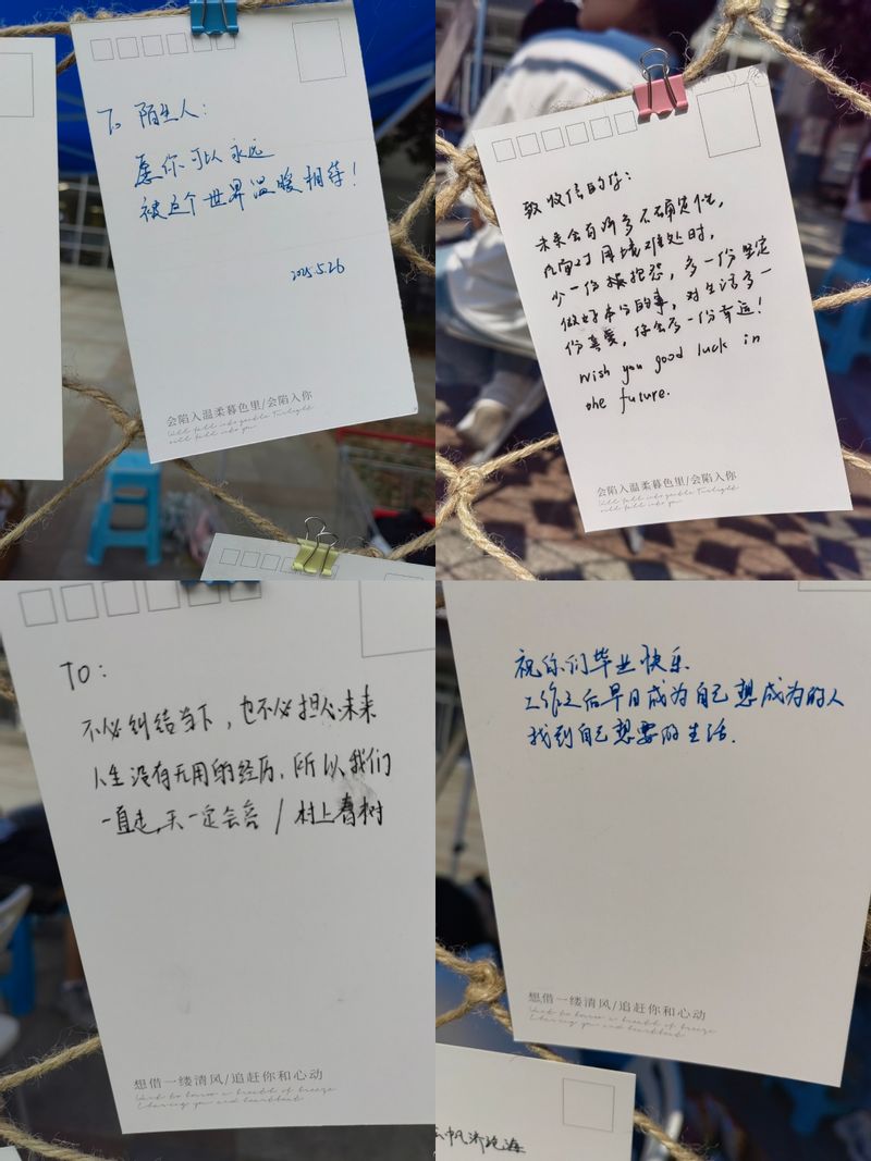 活动现场,同学们以明信片为情感容器,将心底的故事、祝福与期许娓娓道来。有不少同学写下了对陌生人的祝福,一句“愿你可以永远被这个世界温暖相待!”,凝结着同学们对彼此的勉励。也有写给即将毕业的学长学姐的信,“祝你们毕业快乐,工作之后早日成为自己想成为的人,找到自己想要的生活”。质朴祝福勾勒出对美好未来的期许画卷,简单话语成为连接当下与远方的精神桥梁。