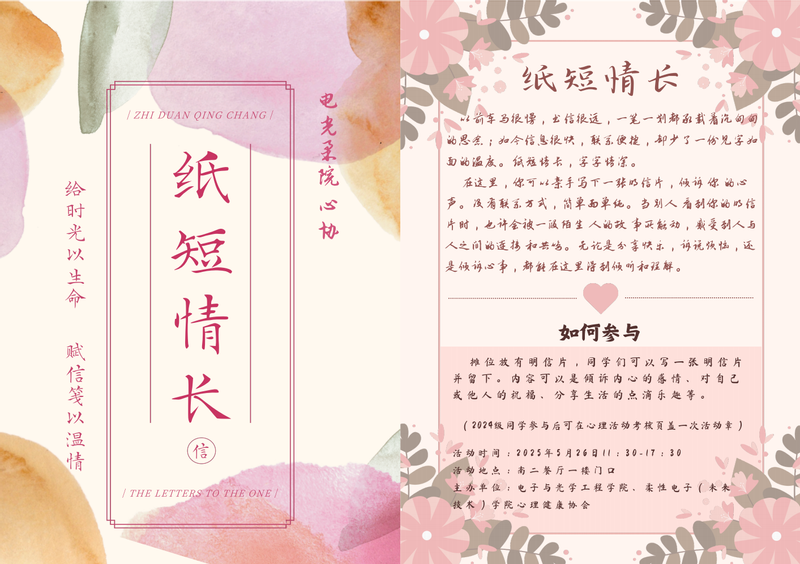 纸短情长,笔细意深;一纸信笺诉衷肠,半卷心语寄温情。5月26日,黑料 心理健康协会主办的心理健康教育活动之明信片征集圆满结束!此次活动以“阳光心灵,‘邮’你同行”为主题,为师生搭建了一座传递情感、珍藏美好的桥梁。